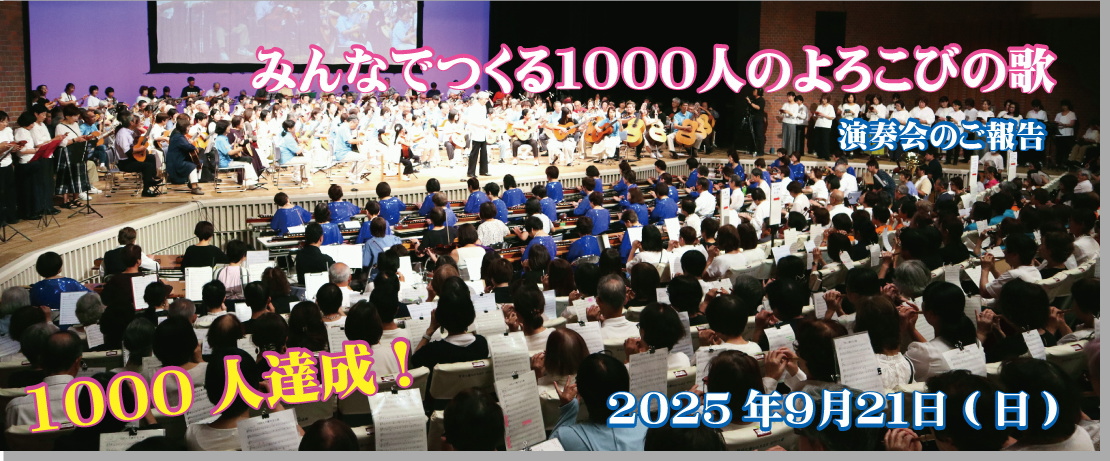 小山 清からごあいさつ ぎっしりとステージに並ぶギターとウクレレに、反響版を組むスペースすらありません。オーケストラピットには大正琴の集団。客席を埋め尽くす“よし笛”オカリナ、リコーダーにハーモニカ。そして打楽器コーナーには竹でつくった“竹楽器”そして、和太鼓奏者たちも居る。よく見ると、ヴァイオリンも三線も、ファゴット、クラリネット、何とチューバの姿も! 誰がこの音を想像することができるでしょうか。しかし、会場にはあたたかで調和のとれた魂を揺さぶられる音が響き渡りました。 1000人でつくり上げた世界無二の響きでした。 |
